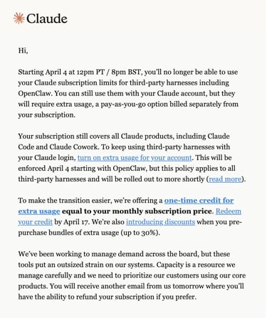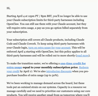 OAuth token erişimini kestiler ve "Ekstra Kullanım" (Extra Usage) faturalandırmasını getirdiler; bu da çoğu kullanıcı için OpenClaw'ı Claude ile çalıştırmayı ekonomik olarak imkansız hale getiriyor.